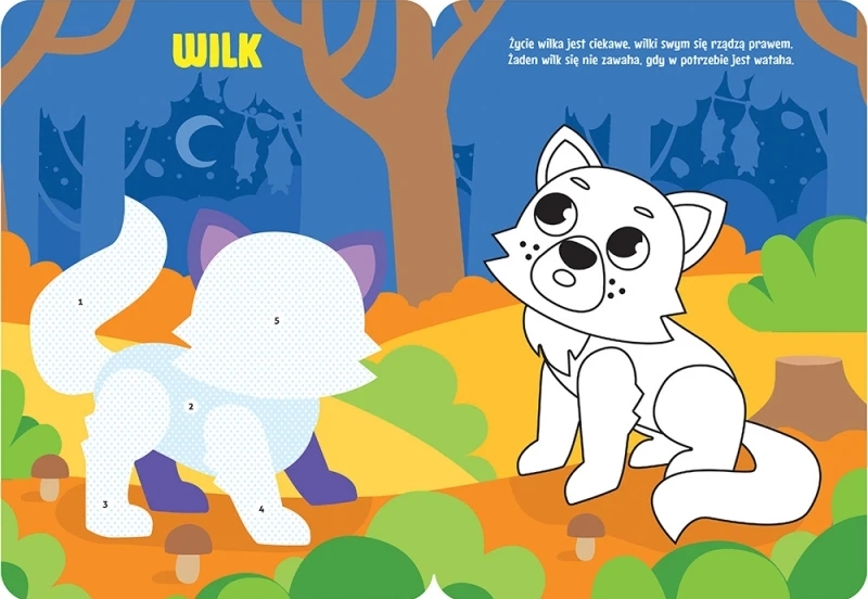 Kreatywna książeczka dla młodszych przedszkolaków - dzieci poznają zwierzęta leśne, kolorują je oraz wyklejają. Doskonała zabawa sensoryczna i manualna – sposób na owocne spędzenie czasu przez dziecko oraz wzbogacenie jego wiedzy.