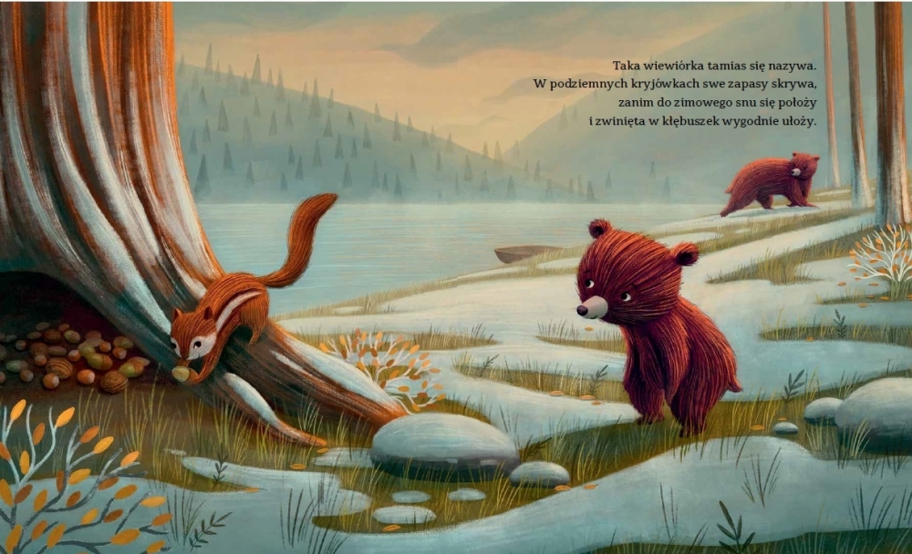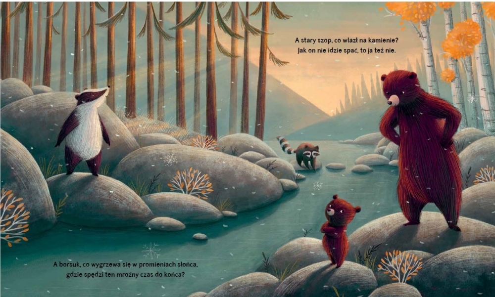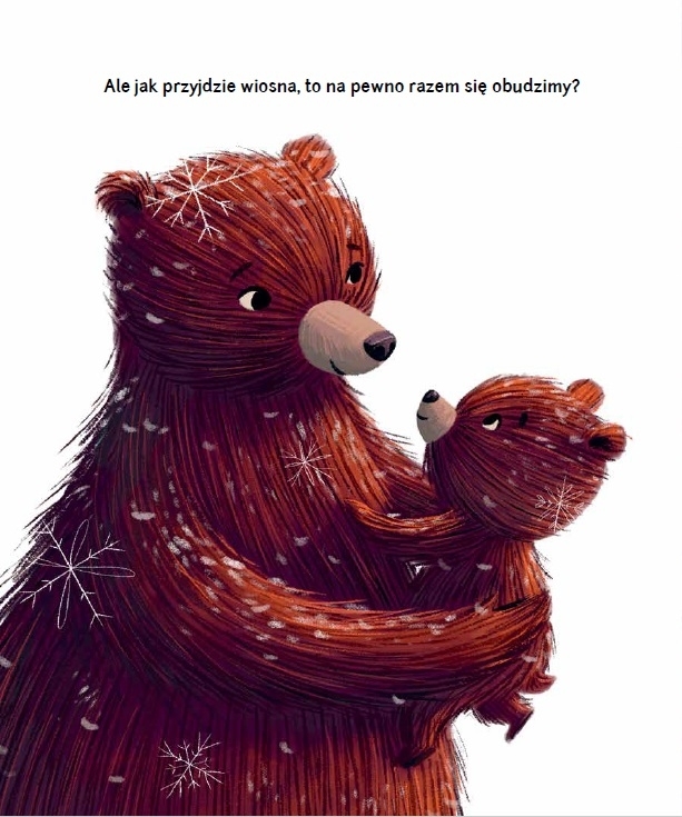 Niedźwiadek idzie z mamą przez las. Ciepłe barwy odchodzącej jesieni powoli przykrywa srebrzysty szron, a potem otula śnieg. Mama cierpliwie – łagodnie i czule odpowiada na pytania synka. Przekonuje, że inne zwierzęta niebawem też ułożą się do snu. I zapewnia go, że potem przyjdzie wymarzona wiosna, pełna jasnych kolorów i nowych przygód.