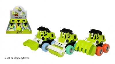 Pojazdy budowlane FARM Truck w różnych wersjach (np. spychacz, walec). W ekspozytorze znajduje się 6 sztuk. Cena dotyczy jednej sztuki. Zabawka przeznaczona dla dzieci od lat 3. Podane wymiary są przykładowymi wymiarami zabawki.
