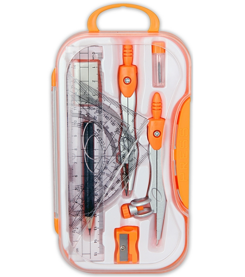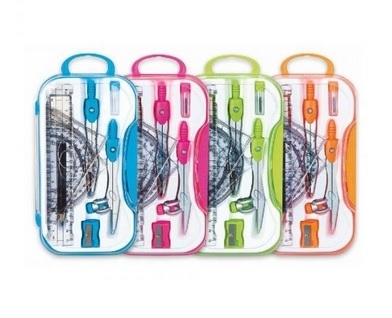 Zestaw składający się z dwóch cyrkli: metalowego z grafitem 2 mm oraz z ołówkiem , kompletu geometrycznego, temperówki i pojemnika na zapasowe grafity. Całość w kolorowym etui z zawieszką.