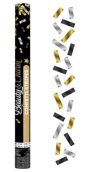 Nasze konfetti z kolekcji Beauty Charm to elegancki dodatek do każdej wyjątkowej okazji. Wypełnione lśniącymi prostokątnymi kawałkami konfetti w kolorach czarnym, złotym i srebrnym, dodadzą niezapomnianej iskry do urodzin, imienin, rocznic czy sylwestra. Przygotuj się na to, aby kolorowy deszcz spadł na ciebie i twoich gości, gdy tylko przekręcisz tubę.