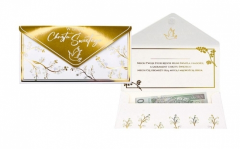 Koperta podarunkowa jest eleganckim sposobem na podarowanie bliskiej osobie banknotu lub karty podarunkowej. Koperta jest kolorowa i uszlachetniona metalizowaną folią hot-stamp, jest solidnie wykonana i wyposażona w rzep, co umożliwia jej wielokrotne otwieranie i zamykanie. Koperta zawiera życzenia w środku.