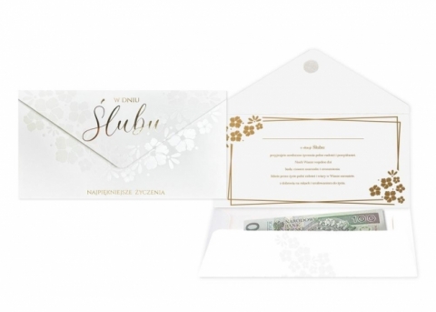 Koperta podarunkowa na Ślub KOP-030 Koperta podarunkowa jest eleganckim sposobem na podarowanie bliskiej osobie banknotu lub karty podarunkowej. Koperta jest kolorowa i uszlachetniona metalizowaną folią hot-stamp, jest solidnie wykonana i wyposażona w rzep, co umożliwia jej wielokrotne otwieranie i zamykanie. Koperta zawiera życzenia w środku. Specyfikacja: wymiary: 20 x 10,5 cm (po złożeniu) wnętrze: życzenia w środku okazja: Ślub