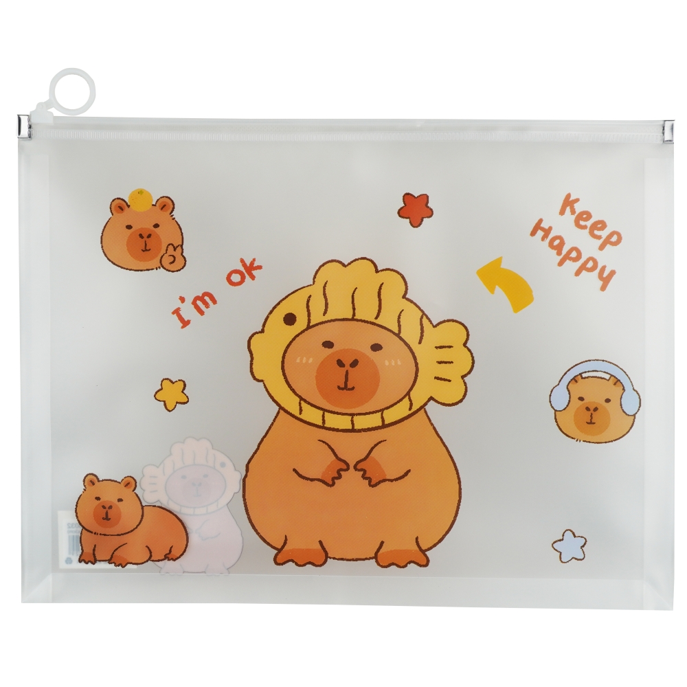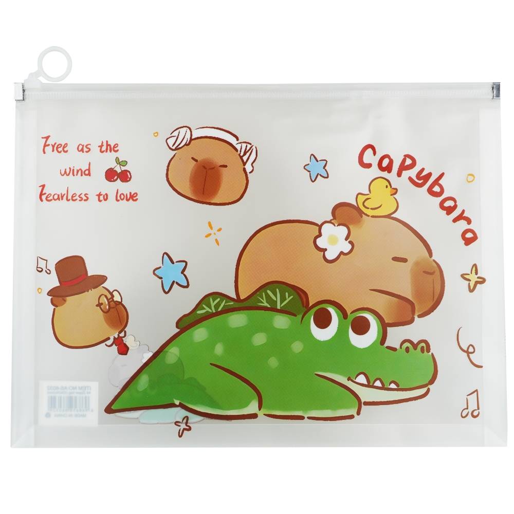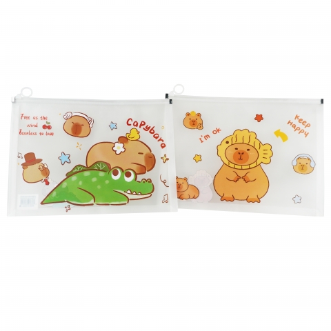 Półprzeźroczysta koperta w formacie A4 z uroczym nadrukiem kapibary i zapięciem strunowym.