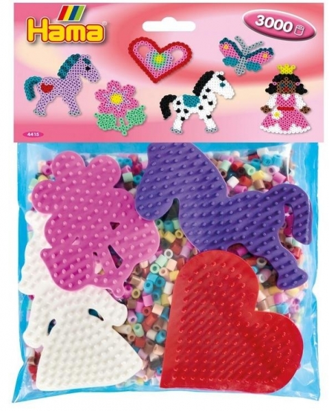 Ok. 3000 koralików, 4 podstawki: małe serce nr 236-05, kucyk nr 321-07, mały kwiatek nr 327-48 i mała księżniczka nr 328. Kolorowa, drukowana karta z projektem, instrukcja i papier do prasowania.