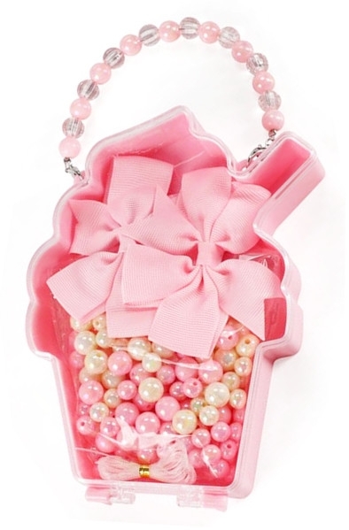 Zestaw do robienia biżuterii składający się z perłowych koralików, kokardek i sznurka spakowany w plastikową torebkę w kształcie babeczki. Torebka posiada rączkę z koralików. Poidane wymiary są przybliżonymi wymiarami torebki.