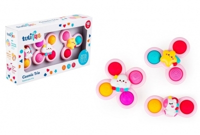 Kręć i wciskaj, gdzie tylko zechcesz! Zestaw trzech uroczych zabaweczek dostarczy wesołej rozrywki w dowolnym miejscu. Każda z zabaweczek posiada kolejno dwa, trzy lub cztery kolorowe pola do wciskania, z wytłoczonymi kształtami. Zabawa polega na przepchnięciu kuleczek na drugą stronę zabawki, a następnie wypchnięciu ich z powrotem do góry. W zestawie znajdują się praktyczne przyssawki, dzięki którym bez trudu przymocujesz zabawkę do dowolnej czystej i gładkiej powierzchni. Po przymocowaniu, można kręcić nią za pomocą paluszka.
