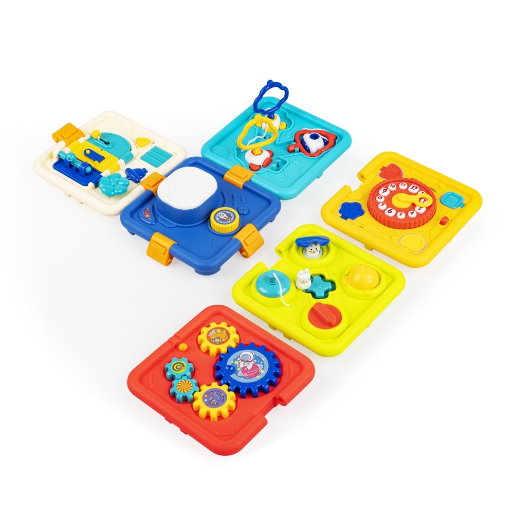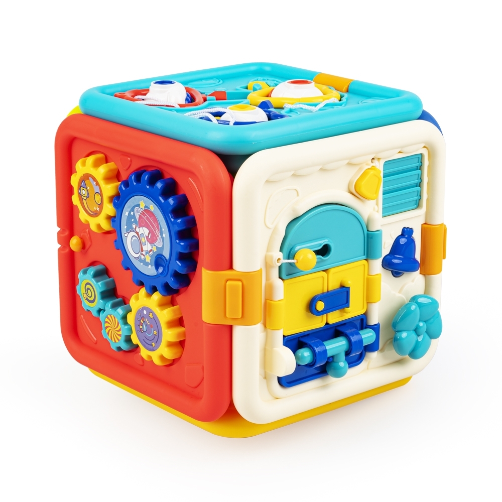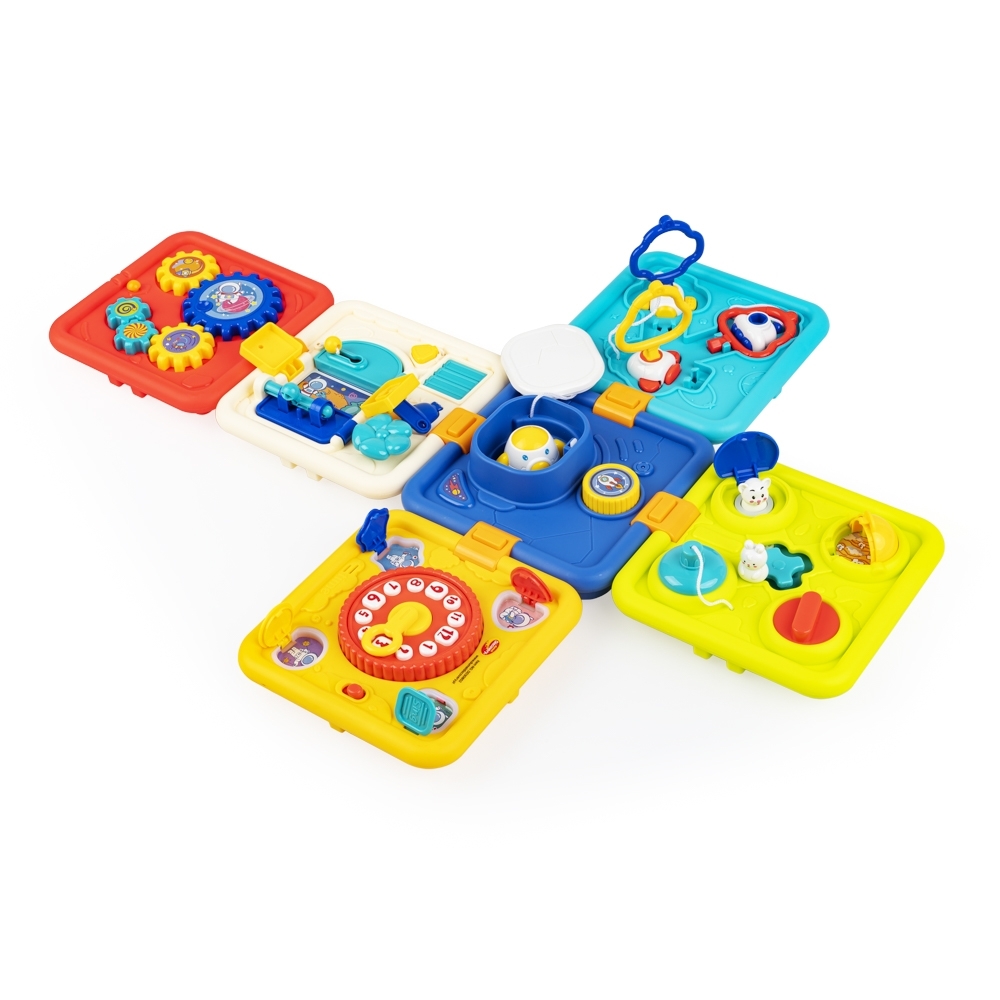 - 6 ścianek, a na każdej z nich inna zabawa: 1) naciśnij, a rakieta wystrzeli w górę, 2) prowadź króliczka, aby otwierać kolorowe klapki, 3) przesuwaj strzałkę zegara i słuchaj ciekawostek o porach dniach, 4) dopasuj i przekręć kluczyki, 5) odsłoń żaluzje, zamykaj i otwieraj drzwi na różne sposoby, 6) kręć trybikiem, aby wprawić w ruch kolejne;