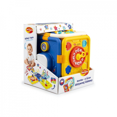 Pomysłowa Kostka umożliwia zabawę na wiele różnych sposobów. Na każdej z jej ścianek znajdują się inne, praktyczne zadania, z którymi maluch może ćwiczyć sprawność paluszków, poznawać zależności przyczynowo skutkowe i rozwijać swoje zdolności poznawcze. Czeka tu uroczy króliczek, którego należy przeprowadzić przez labirynt, aby otworzyć kolorowe klapki, rakieta, która po naciśnięciu przycisku wyskakuje w górę oraz zegar opowiadający o porach dnia i czynnościach z nimi związanymi. Dodatkowo, znajdują się tu kluczyki, do dopasowywania i przekręcania, drzwi do otwierania na kilka sposobów, żaluzje do odsłaniania oraz kolorowe trybiki do kręcenia. A co najlepsze, ścianki zabawki można połączyć ze sobą w kostkę lub odpiąć którąś z nich i bawić się nią oddzielnie! To rozwiązanie z pewnością sprawdzi się w podróży lub w przypadku korzystania z zabawki na niewielkiej przestrzeni.