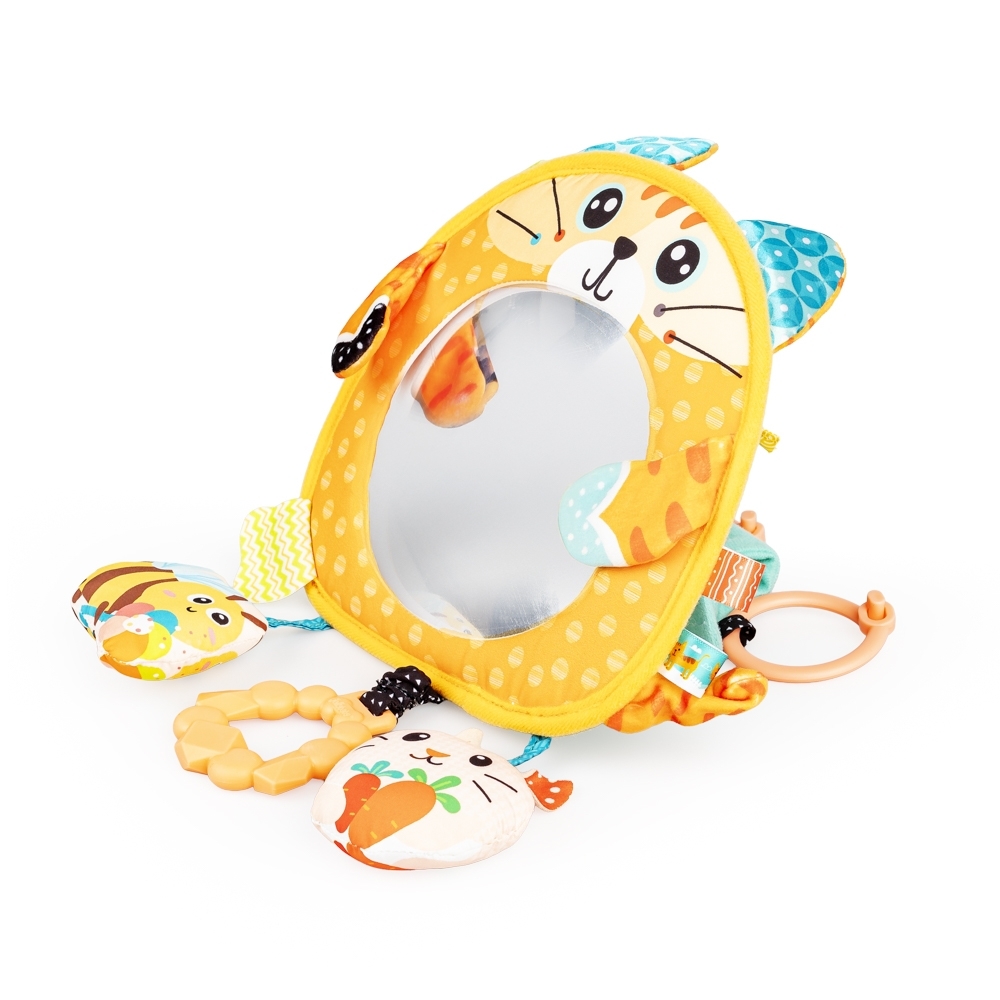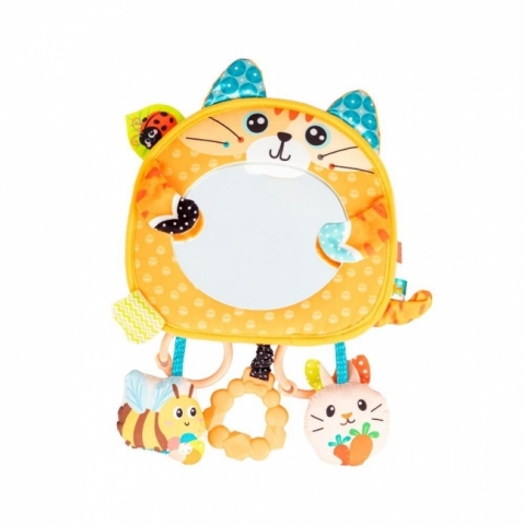 Ten śliczny kotek zapozna dzidziusia z własnym odbiciem, a wszystko za sprawą bezpiecznego lusterka, zdobiącego jego brzuszek. Zabawka wyposażona została w dodatkowe niespodzianki, a są nimi grzechotka, gryzak oraz szeleszcząca pszczółka. Materiały, z których wykonany został kotek i przyczepione do niego elementy odznaczają się zróżnicowanymi fakturami, przez co eksplorujący je maluch może rozwijać zdolności poznawcze, ucząc się odkrywać świat za pomocą zmysłów. Zabawkę można postawić, za pomocą zapinanej na rzep podstawki, lub powiesić na szczebelkach łóżeczka czy uchwycie wózka, na doszytych do zabawki zawieszkach i troczkach.