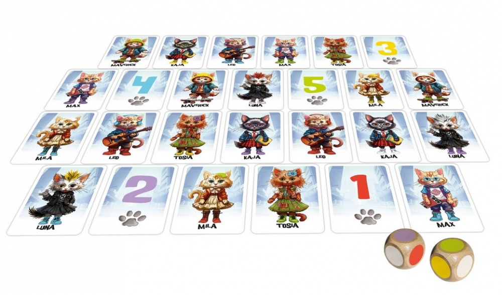 Zasady gry: na stole rozkłada się 21 kart przedstawiających koty w butach w różnych kolorach oraz z różnymi kolorami elementów na głowie. Jeden z graczy rzuca dwiema kostkami, na których ściankach widnieją różne kolory. Zadaniem wszystkich uczestników jest jak najszybsze odnalezienie i złapanie karty kota, który ma jednocześnie buty i element na głowie (okulary, kaptur, irokez) w kolorach wskazanych przez kostki.