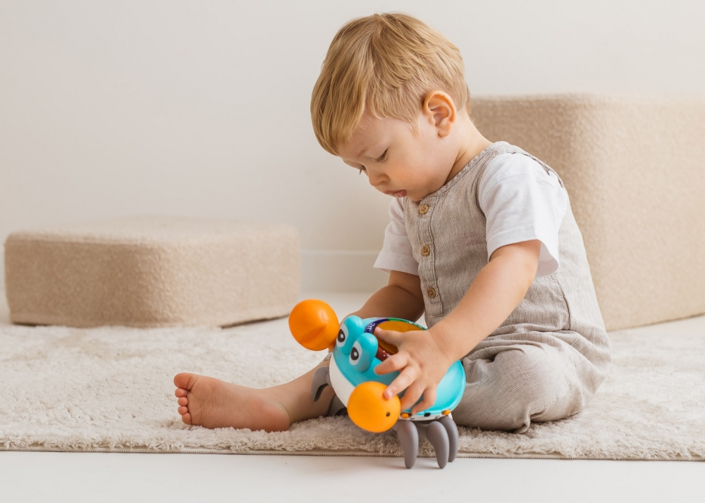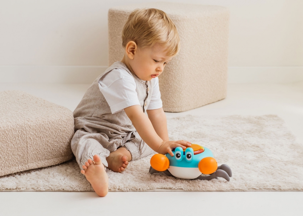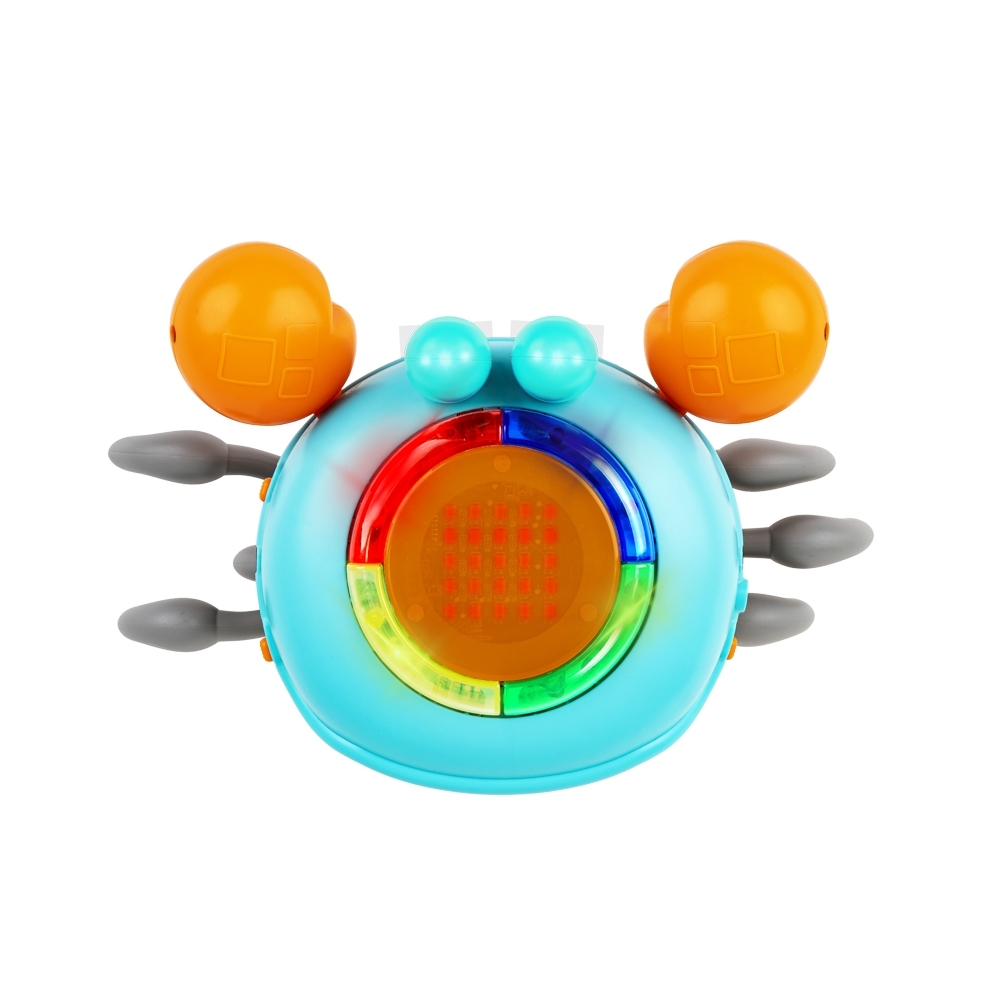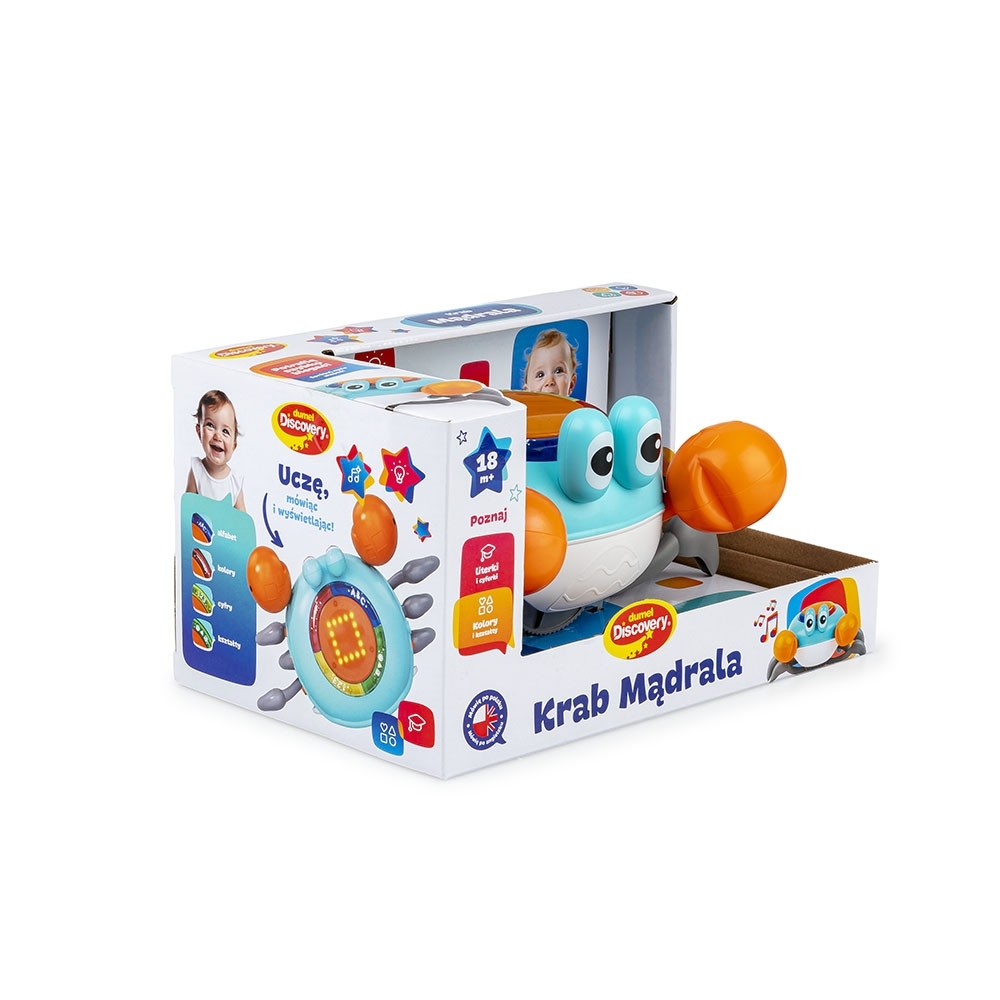 Tak wiele funkcji zamkniętych w tak niewielkiej, uroczej skorupie! Ten zabawny krabik rozweseli na wiele sposobów, łącząc w sobie walory edukacyjne oraz rozrywkowe. Zabawka posiada dwa tryby działania, statyczny oraz dynamiczny, a w ramach każdego z tych trybów potrafi działać z dźwiękiem lub bez. W trybie dynamicznym krab szybciutko porusza się na boki, a czujniki przeszkody, pomagają mu uniknąć stłuczki. W trybie statycznym zabawka wyświetla na skorupie różne kształty, literki lub cyferki, w zależności od wybranej kategorii edukacyjnych treści, którą aktywujemy, poprzez naciśnięcie jednego z kolorowych przycisków okalających wyświetlacz na skorupie. Zabawka mówi w języku polskim oraz angielskim, a za wybór języka odpowiada przełącznik, znajdujący się z boku kraba.