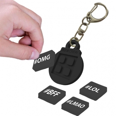 - Kreatywny silikonowy breloczek PIXIE CREW czerwony z 4 multipikselami z motywem popularnych hasztagów: #OMG, #LOL, #BFF, #CUTE..