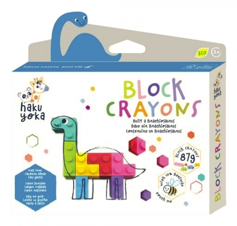 Eko kredki wykonane są z 10% wosku pszczelego, a ich opakowania wykonane są z papieru FSC.Nie pozostawiają plam.Opakowanie zawiera kredki w kształcie klocków w różnych kolorach.