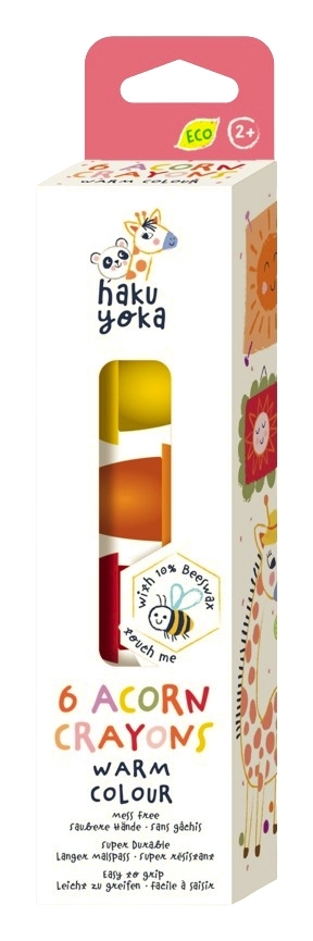 Eko kredy wykonane są z 10% wosku pszczelego, a ich opakowania wykonane są z papieru FSC. Nie pozostawiają plam. Opakowanie zawiera 6 kredek żołędzi w ciepłych kolorach.