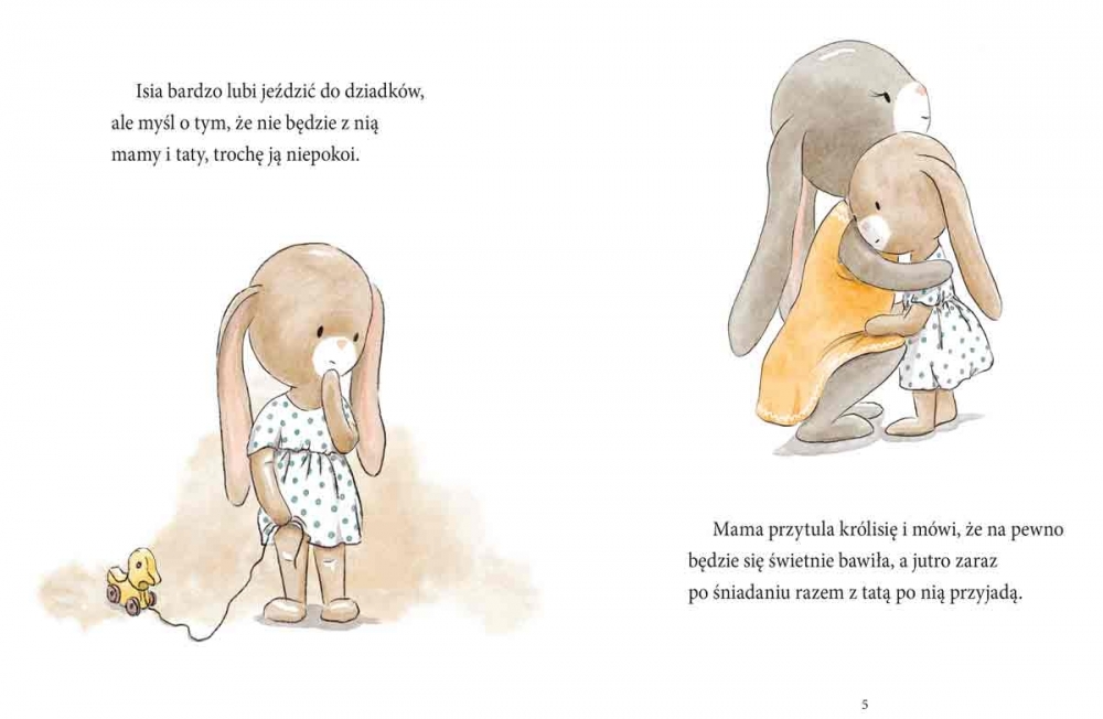 Isia po raz pierwszy w życiu ma spędzić cały dzień i noc bez rodziców u babci i dziadka! Bardzo lubi tam jeździć, ale tym razem trochę się niepokoi. Bo co, jeśli mama i tata będą za nią tęsknić? Albo ona sama w nocy usłyszy jakieś dziwne skrzypnięcie? Na wszelki wypadek lepiej zabrać trochę ulubionych rzeczy, na przykład żółtego misia czy ukochaną lalkę Hanię. Z nimi u boku oraz dzięki wsparciu dziadków króliczka dużo łatwiej poradzi sobie z tęsknotą za rodzicami!