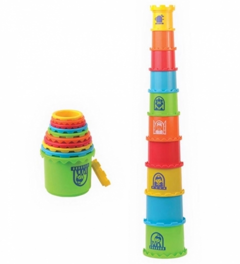 Dziecko ma do dyspozycji 10 kubeczków o różnej wielkości i kolorach, każdy oznaczony cyferką. Maluch może ułożyć z kubeczków wieżę, której wysokość to, aż 55 cm! Dzięki temu, że kubeczki są ponumerowane dziecko układa je po kolei i uczy się liczyć. Kubeczki mogą służyć również jako zabawka do piaskownicy. Zabawka wpływa na kształtowanie koordynacji wzrokowo-ruchowej, zdolności motorycznych oraz uczy liczb.