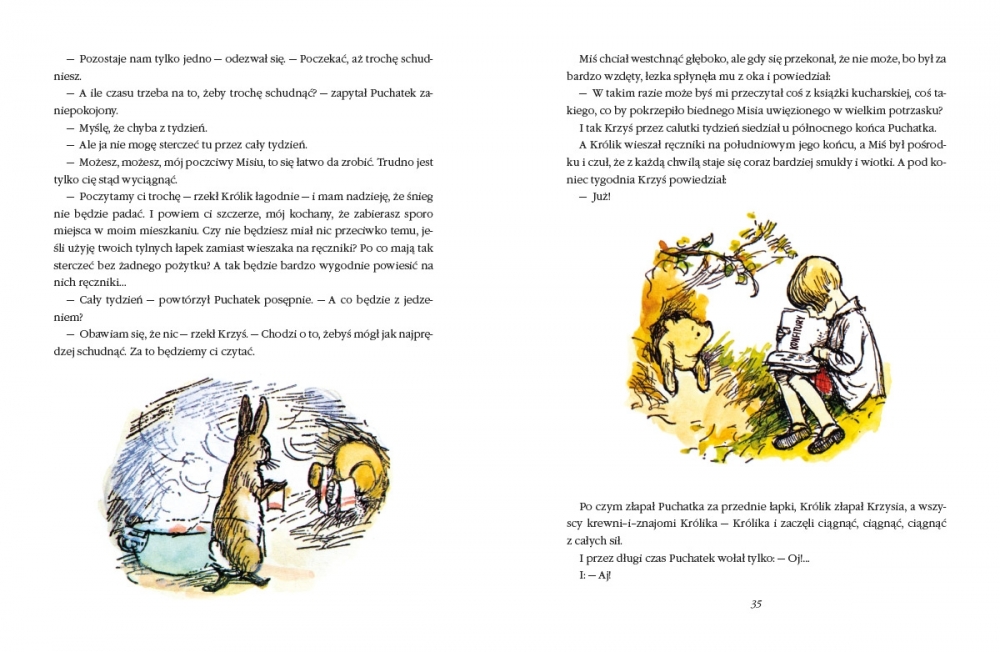 Zajrzyjcie do Stumilowego Lasu, gdzie najsłynniejszy miś na świecie przeżywa fascynujące przygody ze swoimi przyjaciółmi. Obdarzone ludzkimi cechami charakteru zwierzątka śmieszą i bawią z jednej strony naiwnością, z drugiej – filozoficznym podejściem do życia. Niezwykłe ilustracje Ernesta H. Sheparda oraz doskonały przekład Ireny Tuwim sprawiają, że od wielu lat książki o Krzysiu, Puchatku, Kłapouchym i Prosiaczku należą do ulubionych lektur dzieci i młodzieży.