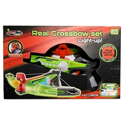 w zestawie znajduje się: kusza do samodzielnego montażu, kołczan, tarcza, 3 strzały na przyssawki. Kusza posiada efekty świetlne.