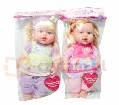 Gumowa lalka z długimi, pięknymi włosami. Płacze i mówi po polsku (5 zdań: "Przytul mnie, bardzo Cię kocham", "Mamusiu, ukołysz mnie do snu",