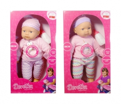 Śpiewająca lalka Dorotka. Lalka interaktywna. Śpiewa piosenki: "Pieski małe dwa", "Jesteśmy jagódki", "My jesteśmy krasnoludki" oraz mówi, wita się, prosi, żeby ją przytulić i ukołysać do snu, zachęca do zabawy, pyta o obiadek itp. Lalka przeznaczona dla dzieci powyżej 18 miesiąca życia. Zabawka działa na baterie typu CR2032. Baterie znajdują się w zabawce. Lalka zapakowana w kartonowe opakowanie z przezroczystym okienkiem. Zabawka występuje w kilku wersjach kolorystycznych, wybierana losowo. C