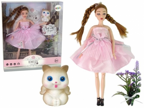 W zestawie razem z lalką Emily znajdziesz również piękne kwiaty oraz kotek o przyjaznej mince, o wymiarach 6 cm x 5 cm x 4 cm. Te dodatki są idealne do tworzenia różnorodnych scenek i opowieści podczas zabawy.