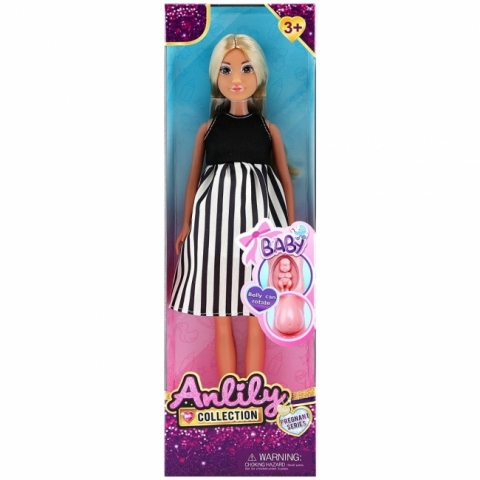 Lalka AnLili "Pregnant Series" - Lalka w Ciąży z Obrotowym Brzuszkiem i Bobasem! Przedstawiamy wyjątkową lalkę AnLili z serii "Pregnant Series", która w realistyczny, a jednocześnie subtelny sposób przedstawia temat ciąży i macierzyństwa. To idealna zabawka edukacyjna dla dzieci, która pozwala na poznanie procesu narodzin i rozwijanie empatii oraz opiekuńczości. Główne cechy produktu: Lalka w ciąży: Lalka ma długie, blond włosy i ubrana jest w modną, czarno-białą sukienkę w paski, co nadaje jej współczesny wygląd. Obrotowy brzuszek: Najbardziej innowacyjną cechą jest specjalny, obrotowy brzuszek ("Belly can rotate"), który pozwala na umieszczenie w nim figurki bobaska. Dziecko może "wyjmować" i "wkładać" dziecko, naśladując poród, co jest edukacyjne i fascynujące. Figurka bobaska: W zestawie znajduje się mała figurka bobaska, którą można umieścić w brzuszku lalki. Rozwija empatię i odpowiedzialność: Zabawa lalką w ciąży uczy dzieci o cyklu życia, rolach rodzicielskich i odpowiedzialności związanej z opieką nad nowym członkiem rodziny. Pobudza wyobraźnię: Dziecko może odgrywać role, tworzyć własne historie o macierzyństwie i rodzinie, co stymuluje kreatywność i rozwój emocjonalny. Estetyczne opakowanie: Lalka jest zapakowana w eleganckie, przezroczyste pudełko, które prezentuje jej wygląd i funkcje, co czyni ją atrakcyjnym prezentem. Bezpieczne dla dzieci: Produkt wykonany jest z bezpiecznych materiałów. Zalecany wiek: 3+ (zgodnie z oznaczeniem na opakowaniu). Wielkość opakowania: 32x10x6cm Podaruj dziecku lalkę AnLili "Pregnant Series" i pozwól mu na twórczą i edukacyjną zabawę, która rozwija zrozumienie i czułość.