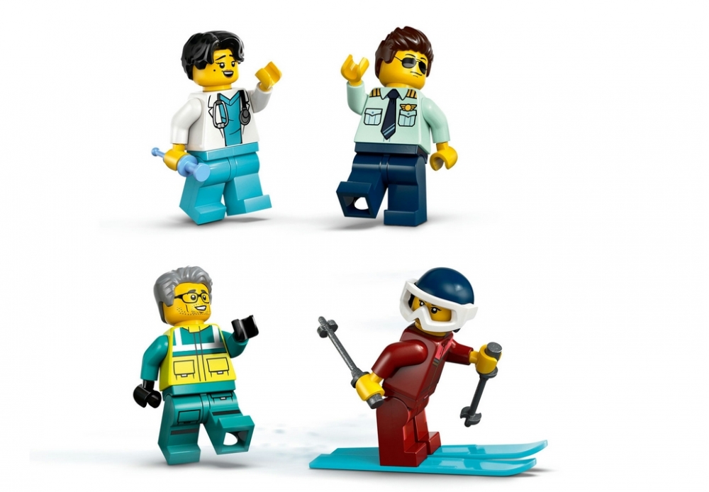 - Zawartość zestawu — wszystko, czego dzieci potrzebują, aby zbudować samolot ratunkowy, skuter śnieżny i małą scenkę z lotniskiem i wiatrowskazem, a także minifigurki pilota, lekarza, ratownika medycznego i narciarza
