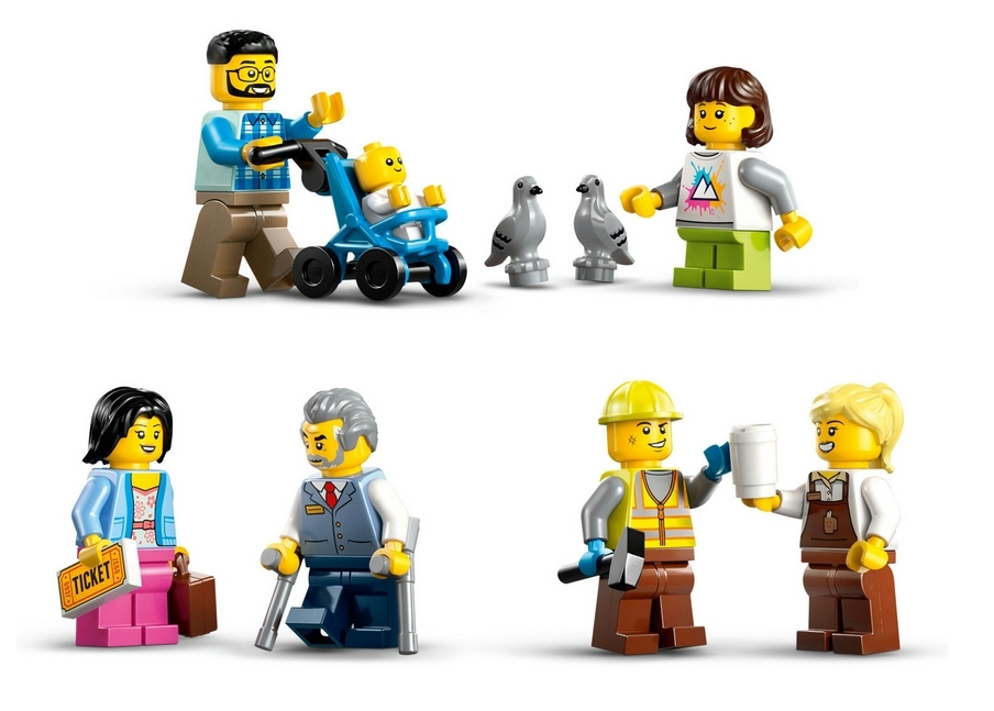 - Zawartość zestawu — wszystko, czego dzieci potrzebują do zbudowania dworca kolejowego, wagonu serwisowego z podnośnikiem, a także sześć minifigurek, figurka dziecka i dwie figurki gołębi do odgrywania ról