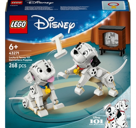 - Szczeniaczkowy zawrót głowy — ta zabawka konstrukcyjna dla dzieci zawiera postacie LEGO® ǀ Disney Szczęściarza i Penny z klasycznego filmu 101 dalmatyńczyków, a także kość z klocków i mały telewizor z ekranem