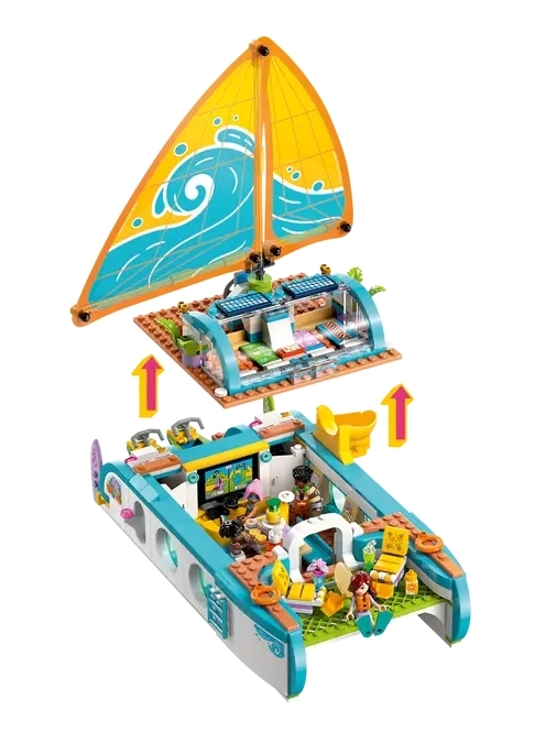 - Zabawkowa łódź z wieloma funkcjami — dzieci mogą zbudować łódź, a potem tworzyć własne historie o przyjaciołach, którzy relaksują się na pokładzie i wypatrują delfinów