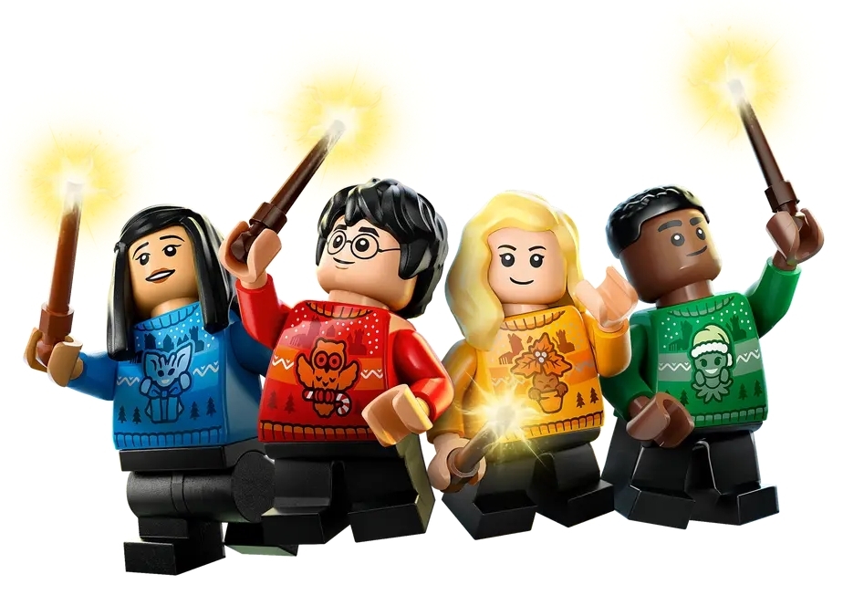 - Osiem minifigurek LEGO® — Harry Potter™, Cho Chang™, Draco Malfoy™, Hannah Abbott, Angelina Johnson, Luna Lovegood™, Blaise Zabini i Cedric Diggory, wszyscy w świątecznych swetrach Hogwartu™ z różdżkami