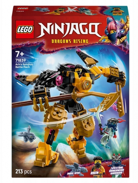 Dzięki zestawowi LEGO® NINJAGO® Mech bojowy Spinjitzu Arina (71839) fani ninja w wieku od siedmiu lat mogą odgrywać sceny z trzeciego sezonu serialu telewizyjnego NINJAGO Powstanie Smoków. Zestaw konstrukcyjny zawiera mecha NINJAGO z ruchomymi ramionami i nogami, które można ustawiać w różnych pozycjach oraz obrotowym, otwieranym tułowiem z miejscem na minifigurkę. Całości dopełniają dwa duże miecze.