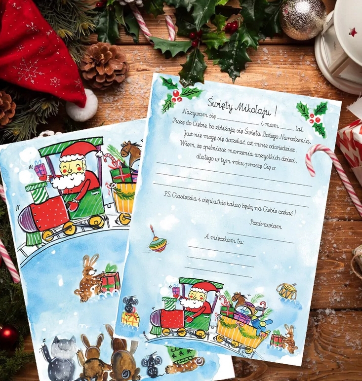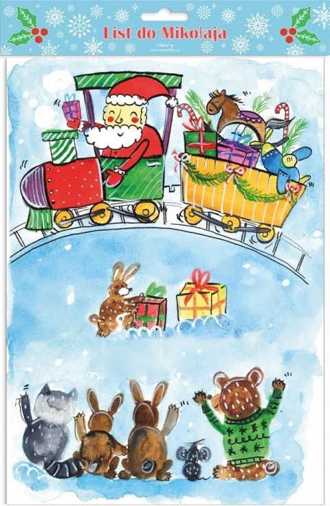 List do Mikołaja MIKOŁAJ Z PREZENTAMI wydrukowany na wysokiej jakości papierze. Produkt składa się z dwóch kartek. Pierwsza kartka do uzupełnienia listu, a druga do namalowania swojego wymarzonego prezentu.