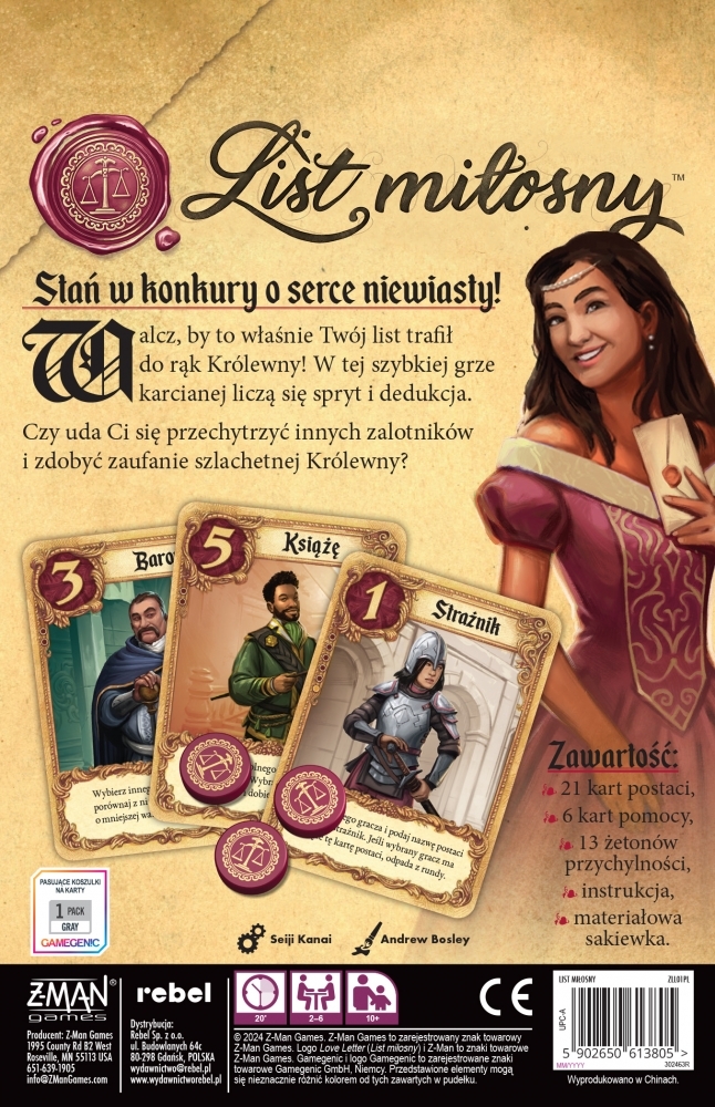 Rozgrywka w List miłosny trwa kilka rund, podczas których wykorzystujesz sojuszników, przyjaciół i członków rodziny królewskiej, aby doręczyli Królewnie napisany przez Ciebie list miłosny. Karta na ręce symbolizuje postać, która aktualnie niesie Twój list. Ta postać może się jednak zmienić w trakcie rundy, w miarę jak będziesz dobierać i zagrywać karty. Każda z postaci, którą możesz dostać na rękę, ma swój unikalny efekt działania. Warto zatem zagrywać je w sposób przemyślany i próbować kontrolować, jakie karty mogą mieć na ręce przeciwnicy. Niektóre efekty pozwalają eliminować innych uczestników zabawy! Rundę wygrywa gracz, który kończy ją z najwyżej punktowaną kartą lub który jako jedyny z niej nie odpadł.