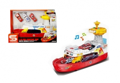 Prom do przewozu samochodów osobowych. Prom wydaje dźwięki syreny alarmowej, płynięcia po morzu oraz wpływania do portu. Kiedy zabawka wydaje dźwięki, świeci także kolorowym światełkiem. Zabawka posiada także otwierane drzwi. Do zestawu dołączono 3 autka. Zabawka działa na baterie typu AG13. Baterie znajdują się w zabawce. Produkt dla dzieci od 3 lat. Zabawka zapakowana w kartonowe opakowanie. Podane wymiary są wymiarami opakowania.