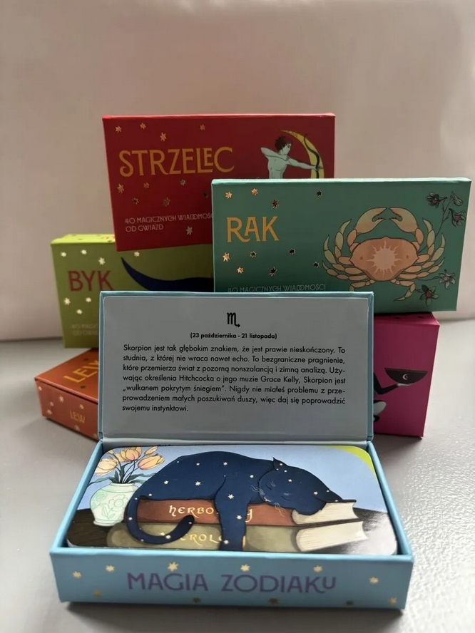 Przesłania na każdej z 40 kart są inspirowane gwiazdami i planetami znajdującymi się w Twoim znaku zodiaku. Potasuj karty, wylosuj jedną z nich, przeczytaj jej treść, a następnie pozwól, by stała się Twoim przewodnikiem na nadchodzący dzień. Możesz też rozdzielić karty według kolorów czterech kategorii: miłość, kariera, wellness i rodzina. Potasuj, zadaj pytanie i wyciągnij jedną kartę z wybranych kategorii. Wiadomość od wszechświata czeka na Ciebie. Czy jest gotów/gotowa, aby jej wysłuchać?