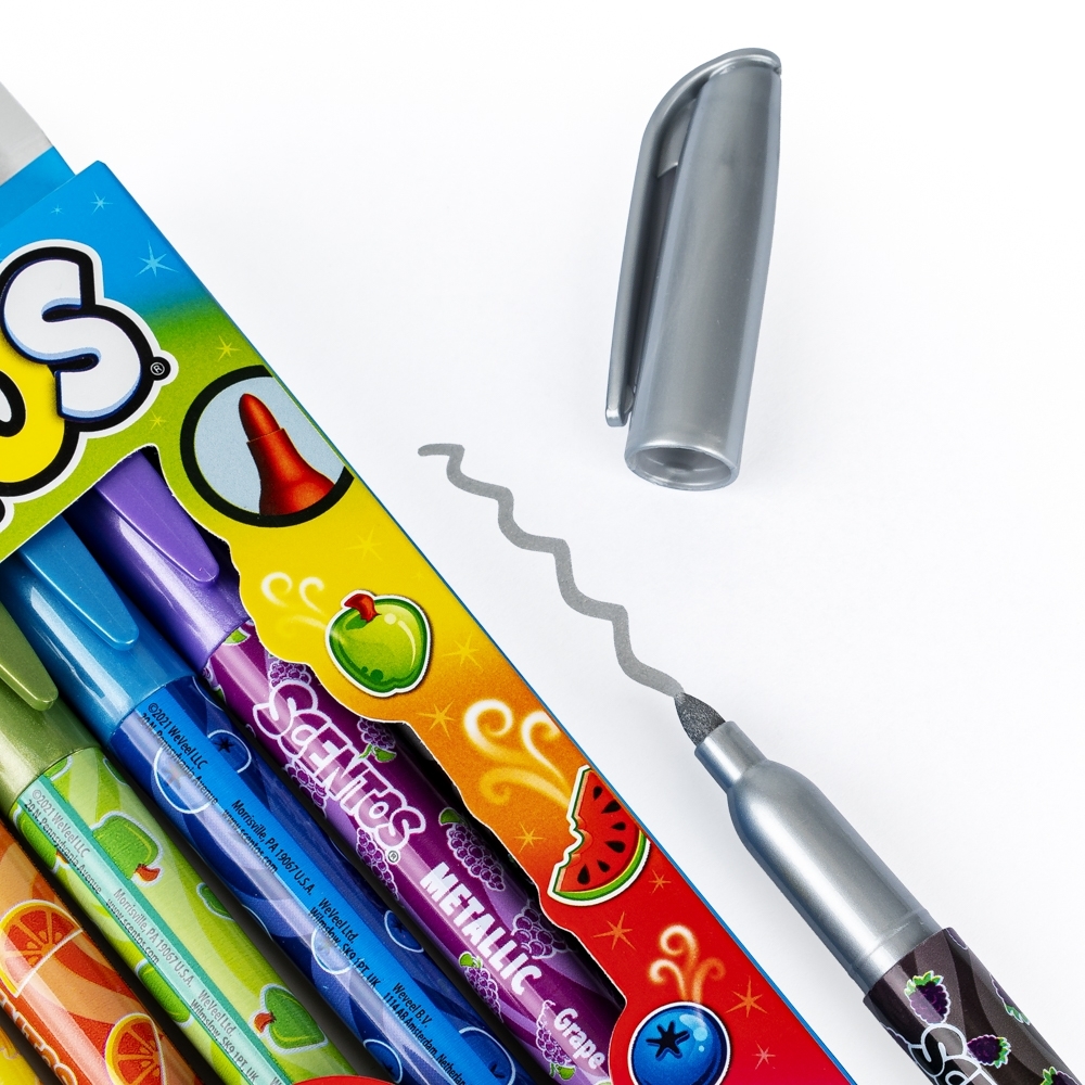Dodaj tworzonym przez siebie tekstom i obrazkom odrobiny lustrzanego błysku! Zestaw pachnących markerów tworzy osiem metalicznych mazaczków w różnych kolorach. Markery pachną słodko, a inspiracją dla zastosowanych w nich zapachach były popularne owoce oraz guma balonowa.