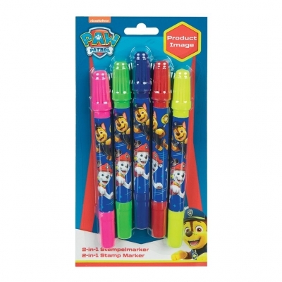 Zestaw Markerów ze Stempelkami 2w1, 5 el. Psi Patrol Zestaw 5 markerów o podwójnej funkcji z grafikami ulubionej bajki Psi Patrol. Z jednej strony końcówka markera w pięciu kolorach: różowym, zielonym, niebieskim, czerwonym i żółtym. Z drugiej stempel. Kategoria wiekowa:3+. Wymiary opakowania: 23 cm x 13 cm x 2 cm.