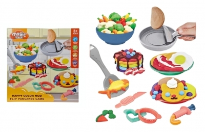 Zestaw kreatywnej masy plastycznej umożliwiający przygotowanie różnych potraw. W komplecie znajdują się akcesoria kuchenne oraz foremki, które pozwalają tworzyć kolorowe dania, takie jak naleśniki czy warzywa. Produkt przeznaczony dla dzieci od 3 lat. Prrodukt zapakowany w kartonowe opakowanie. Podane wymiary są wymiarami opakowania.