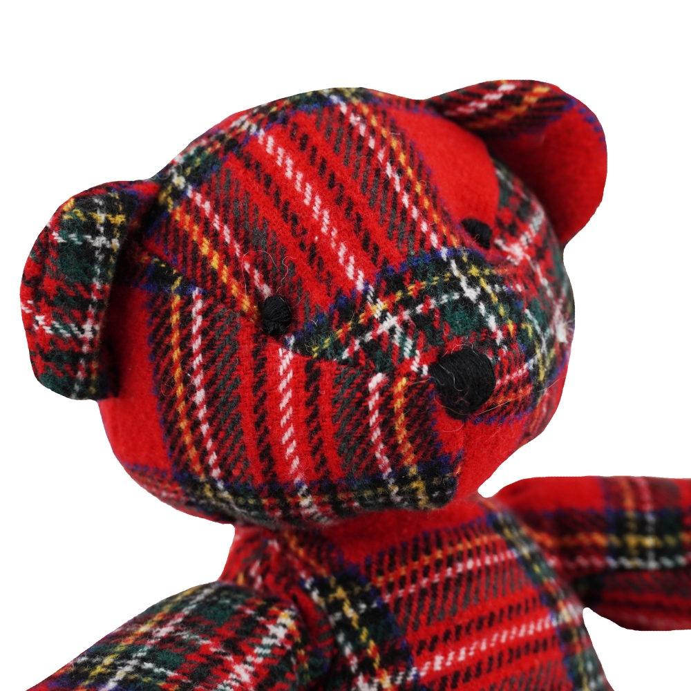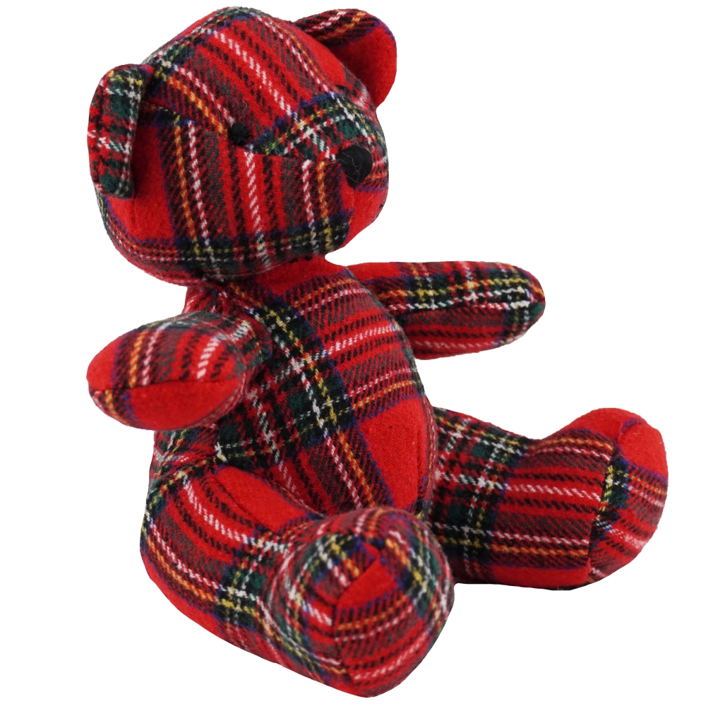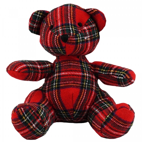 Siedzący, pluszowy miś w stylową czerwono-czarną kratkę.