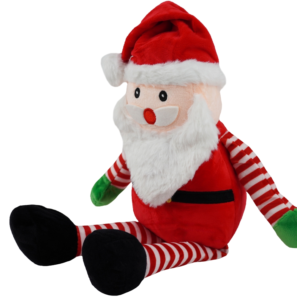 Pluszowy Mikołaj z długimi biało-czerwonymi kończynami - idealny element świątecznego wystroju.