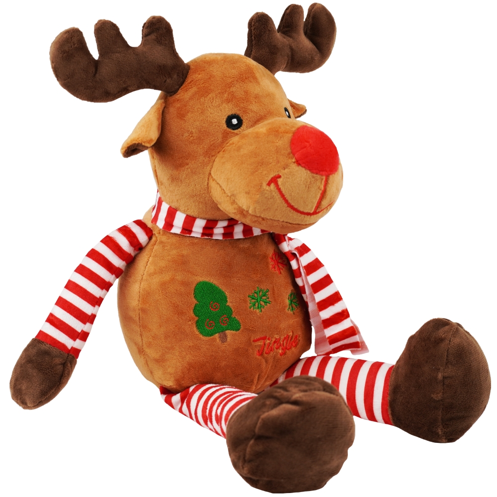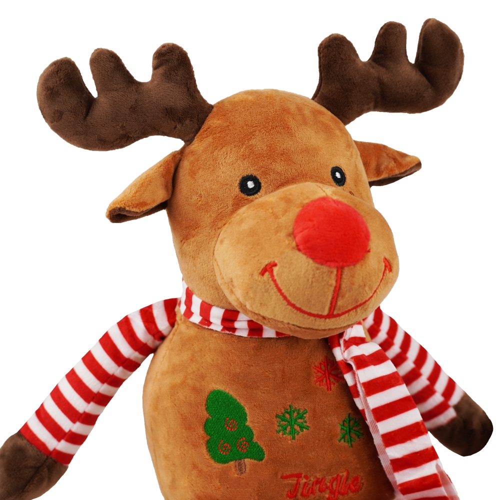 Pluszowy renifer w szaliku i z biało-czerwonymi kończynami - idealny element świątecznego wystroju.