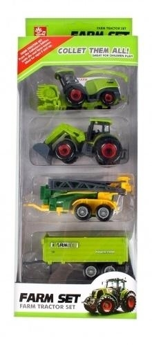 W zestawie znajdują się 2 metalowe maszyny rolnicze: traktor oraz kombajn a także dwie przyczepy. Całość wykonana z metalu oraz plastiku.