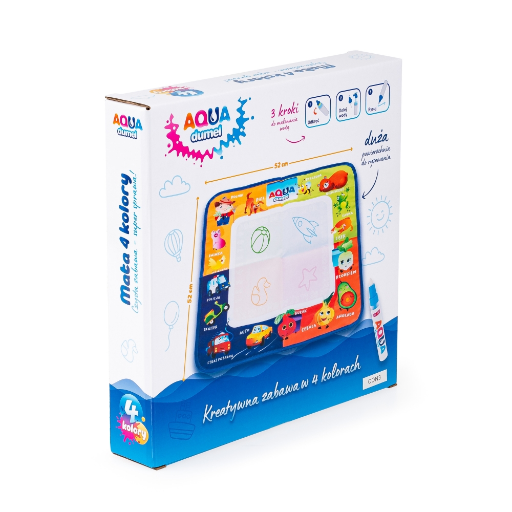 Wyraź się artystycznie w kreatywnej zabawie! Mata do malowania podzielona jest na 4 pola kolorystyczne, co umożliwia tworzenie barwnych rysunków. Jej krawędź ozdobiona jest wesołymi, obrazkami oraz ich nazwami, dzięki czemu dzieci mogą poznawać nowe wyrazy. W zestawie znajduje się specjalny mazak, który, po napełnieniu wodą, będzie malował po macie. Kiedy mata wyschnie, obrazek zniknie, jak zaczarowany!