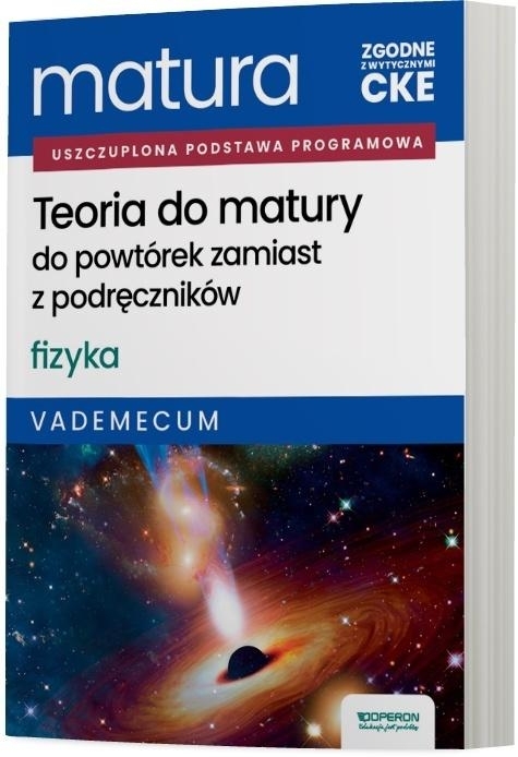 "Publikacja aktualna z wymaganiami CKE,opracowana przez organizatora największych, ogólnopolskich próbnych egzaminów w Polsce. Do powtórek zamiast z podręczników Próbujesz sobie przypomnieć definicje, procesy albo zjawiska fizyczne? Niezbędną wiedzę potrzebną do rozwiązywania zadań na maturze z fizyki, podaną w przystępnej i skróconej formie, znajdziesz w publikacji "Teoria do matury".. Korzystając z tej książki, szybko: powtórzysz,. uzupełnisz i poukładasz sobie w głowie niezbędną wiedzę do zdania matury na 100%.. Co znajdziesz w publikacji "Teoria do matury" z fizyki?. Publikacja "Teoria do matury" obejmuje zagadnienia z działów ze wszystkich lat nauki. W środku znajdziesz: niezbędną, uporządkowaną wiedzę - w formie schematów, wykresów i tabel, żeby ułatwić Ci naukę; definicje i pojęcia wyróżnione kolorami w każdym dziale - dzięki czemu lepiej utrwalisz sobie te treści; ilustracje - skuteczniej zapamiętasz procesy i zjawiska fizyczne;. zestaw wybranych wzorów i stałychfizykochemicznych: taki, jaki otrzymasz na maturze, dzięki czemu oswoisz się z jego wyglądem, treściami i korzystaniem z niego podczas nauki. Znajdziesz tutaj też porady, jak radzić sobie ze stresem, i podpowiedzi, jak skutecznie uczyć się do egzaminu. To nie wszystko. Oprócz powtórki z teorii musisz także poćwiczyć rozwiązywanie zadań egzaminacyjnych? Być może chcesz się dowiedzieć, co zrobić, żeby zyskać maksimum punktów na maturze? Potrzebujesz przeanalizować wzorcowo rozwiązany arkusz egzaminacyjny? To znaczy, że szukasz jednej książki, jaką są "Zadania maturalne z odpowiedziami". Być może chcesz sprawdzić się przed maturą? Jeśli tak, to wybierz "Arkusze maturalne z rozwiązaniami krok po kroku". Możesz także skorzystać z Platformy Operon dla ucznia, czyli naszego cyfrowego wsparcia przed maturą. Znajdziesz tu pełne odpowiedzi do wszystkich zadań wraz z etapami dochodzenia do rozwiązania."