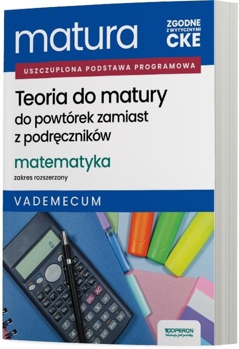 "Publikacja aktualna z wymaganiami CKE, opracowana przez organizatora największych, ogólnopolskich próbnych egzaminów w Polsce. Do powtórek zamiast z podręczników. Nie pamiętasz definicji, wzoru albo pojęcia matematycznego? Nie masz już dostępu do swoich podręczników? Niezbędną wiedzę potrzebną do rozwiązywania zadań na maturze z matematyki na poziomie rozszerzonym, podaną w przystępnej i skróconej formie, znajdziesz w publikacji "Teoria do matury".. Korzystając z tej książki, szybko: powtórzysz,. uzupełnisz i poukładasz sobie w głowie niezbędną wiedzę do zdania matury na 100%.. Co znajdziesz w publikacji "Teoria do matury" z matematyki?. Publikacja "Teoria do matury" obejmuje zagadnienia z działów ze wszystkich lat nauki. W środku znajdziesz: niezbędną, uporządkowaną wiedzę - w formie wzorów, twierdzeń i przykładów do nich, żeby ułatwić Ci naukę; definicje i pojęcia wyróżnione kolorami w każdym dziale - dzięki czemu lepiej utrwalisz sobie te treści; podsumowanie każdego działu - skrótowo podane najważniejsze informacje; zestaw wybranych wzorów matematycznych na egzamin z matematyki- taki, jaki otrzymasz na maturze - dzięki czemu oswoisz się z jego wyglądem, treściami i korzystaniem z niego podczas rozwiązywania zadań. Znajdziesz tutaj też porady, jak radzić sobie ze stresem, i podpowiedzi, jak skutecznie uczyć się do egzaminu. To nie wszystko. Oprócz powtórki z teorii musisz także poćwiczyć rozwiązywanie zadań egzaminacyjnych? Być może chcesz się dowiedzieć, co zrobić, żeby zyskać maksimum punktów na maturze? Potrzebujesz przeanalizować wzorcowo rozwiązany arkusz egzaminacyjny? To znaczy, że szukasz jednej książki, jaką są "Zadania maturalne z odpowiedziami". Być może chcesz sprawdzić się przed maturą? Jeśli tak, to wybierz "Arkusze maturalne z rozwiązaniami krok po kroku". Możesz także skorzystać z Platformy Operon dla ucznia, czyli naszego cyfrowego wsparcia przed maturą. Znajdziesz tu pełne odpowiedzi do wszystkich zadań wraz z etapami dochodzenia do rozwiązania."