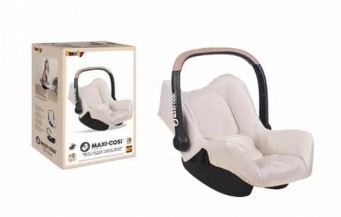 Fotelik z uchwytem w oryginalnym wzornictwie Maxi-Cosi. Ze schowkiem w oparciu siedzenia. Regulowana rączka. Dla lalek do 42 cm (brak w zestawie). Wyprodukowano w Hiszpanii.
