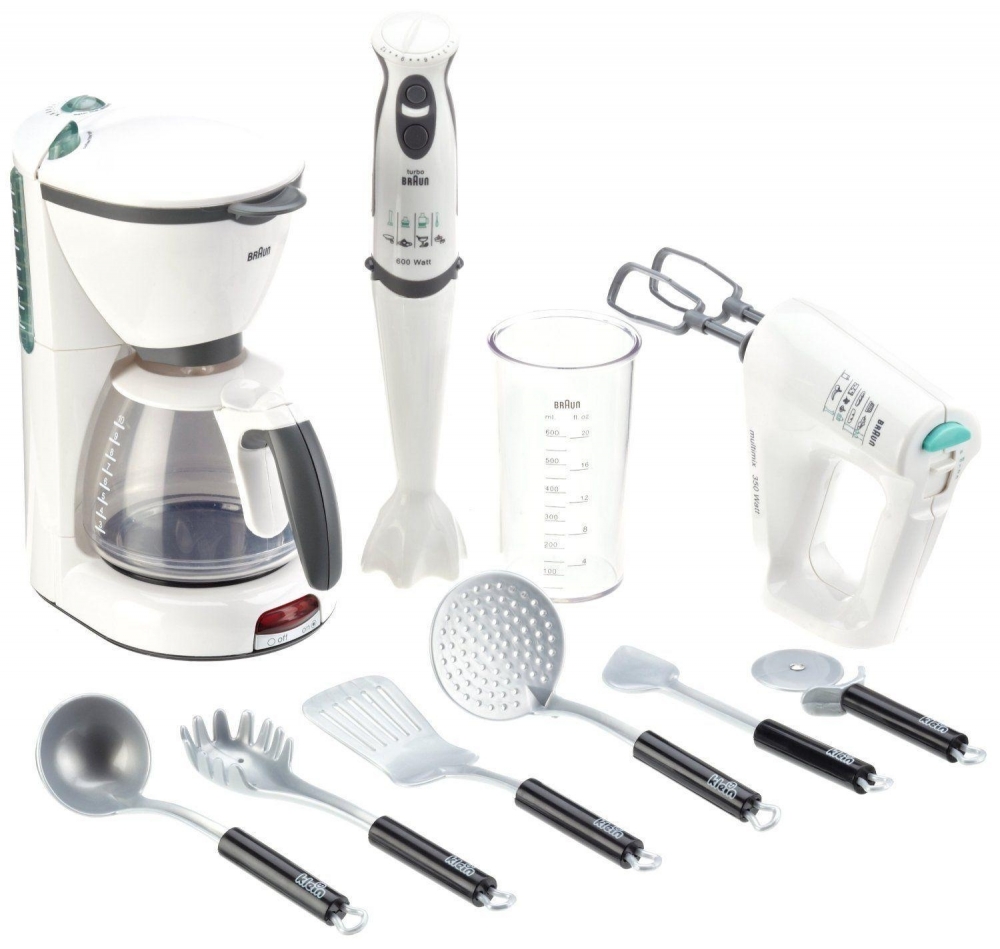 Firma Klein od lat produkuje odpowiedniki prawdziwych narzędzi i akcesoriów AGD, przeznaczone do zabawy dla najmłodszych. Zestaw składa się z ekspresu do kawy, miksera , blendera oraz przyborów kuchennych. Cały zestaw AGD znajdujący się w zestawie jest w kolorze białym z szarymi dodatkami, dzięki czemu całość stanowi doskonałą imitację prawdziwych produktów firmy Braun. Ekspres do kawy posiada realistyczną funkcję przepływu i można w nim bezpiecznie uzupełniać wodę. Mikser ręczny jak prawdziwy, ma obracane mieszadła, które włącza się za pomocą przycisku. Blender wraz z pojemnikiem z miarką (ok. 250 ml), posiada funkcję obracającej się końcówki, a jego nasadkę mieszającą można także zdjąć, co nadaje zabawie jeszcze większego realizmu. Do właściwego funkcjonowania wszystkie te zabawkowe sprzęty AGD potrzebują użycia baterii, które nie są częścią zestawu.