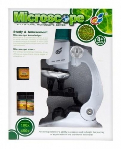 Mikroskop posiada obiektywy: x100, x450. Do zestawu dołączono dodatkowe akcesoria: probówki oraz narzędzia. Produkt wykonany z plastiku oraz metalu.